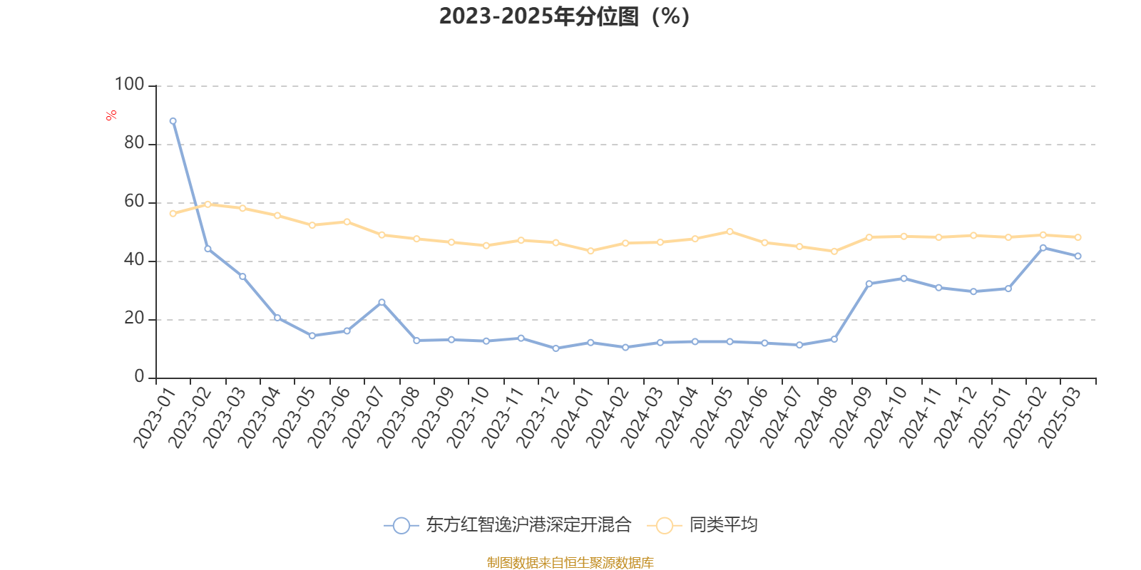 通过所选区间该基金净值增长率分位图,可以观察该基金与同类基金业绩比较情况。图为坐标原点到区间内某时点的净值增长率在同类基金中的分位数。
